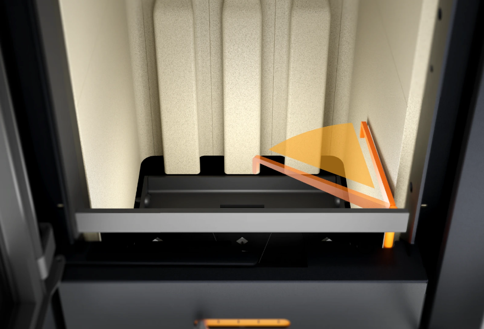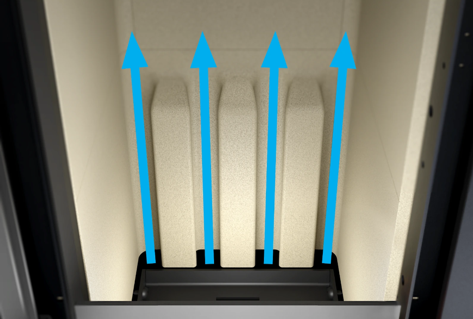 BLAZE SPIRIT wyposażony jest w opatentowany pionowy ruszt wykonany z betonu ogniotrwałego na tylnej ścianie komory, który zapewnia równomierne spalanie drewna kominkowego i możliwość dokładania większej ilości paliwa. Zmniejsza to potrzebę częstego czyszczenia komory paleniska oraz zwiększa wydajność paliwa.